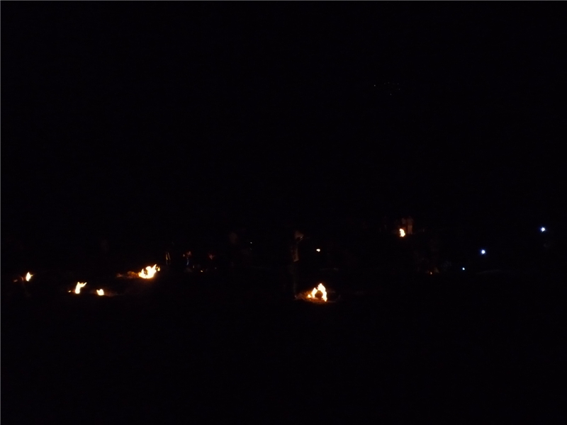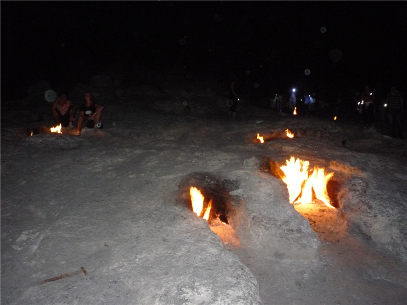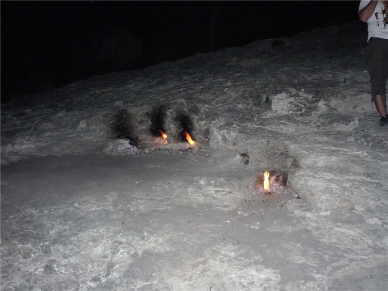 Достигаем вершины. Тут и сям множество очагов пламени, часть спокойно горит, а часть вырывается на поверхность прямо факелом, по типу газовой горелки, по-видимому, давление газа достаточное. Запах газа не похож ни на запах газа на кухне, ни на болотный газ, из чего делаю вывод, что это не метан и не пропан-бутан. Но горит отменно. Интересно, что отверстия выходят на поверхность не вертикально, а горизонтально, таким образом, у каждого язычка есть своя собственная персональная пещерка.