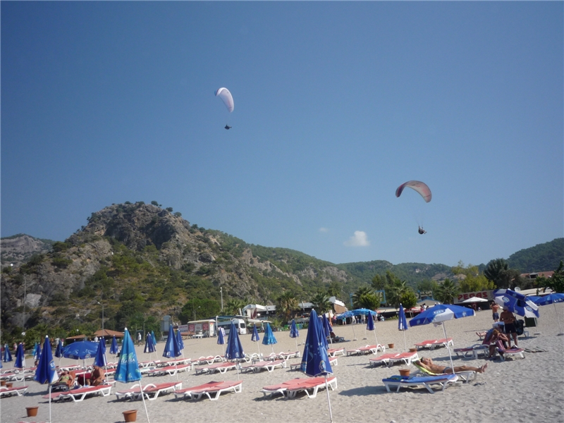 С утра позавтракали и на пляж. Пляж, ничего не скажу, ухоженный. Везде лежаки с прилагающимися зонтиками. Пусто. Море теплое, чистое, просто класс! В небе – неимоверная куча парашютистов, которые опускаются, повисев в небе, прямо на дорожки пляжа.