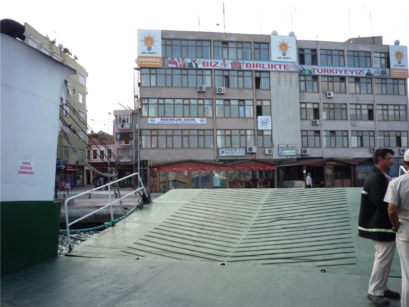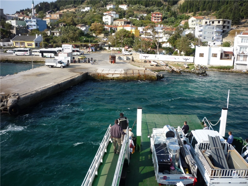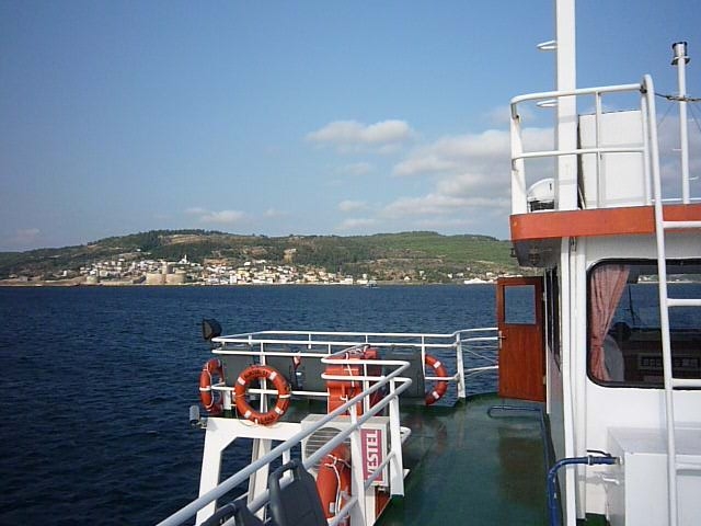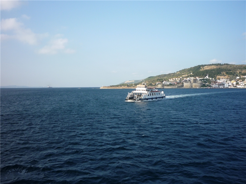 Утром, позавтракав, спешим на паром. Нам надо в Килитбахир, на другой берег Дарданелл. Оказывается, волновались мы зря. Паром ходит каждые 30 минут, очень четко. Платим 18 TL за перевоз автомобиля (паром пассажиров без автомобиля не берет, если же перевозишь автомобиль, то водитель и все пассажиры бесплатно). Поднимается кормовая аппарель, и мы отходим от берега.