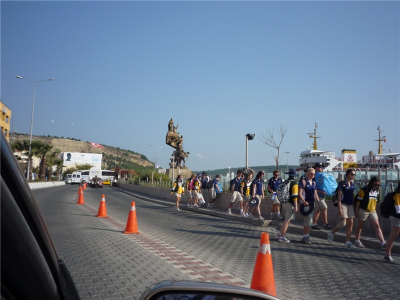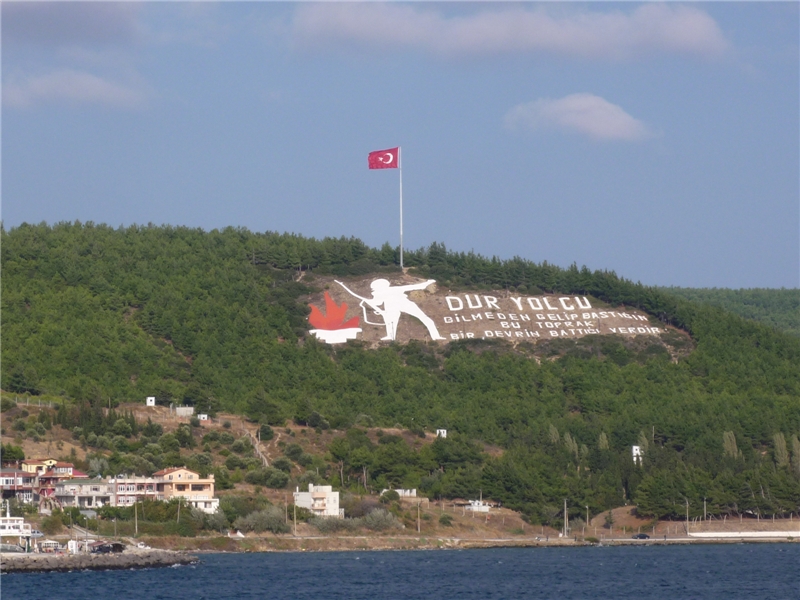 На европейском берегу на склоне горы видим то, что вечером из Чаннакале было видно как ярко светящаяся полоска с какой-то надписью. Теперь понятно, что это одна из мемориальных композиций, коих в здешних местах множество, посвященная погибшим в I мировую войну (конкретнее, в апреле 1915 года сюда, на Галлиполийский полуостров высадился австралийско-новозеландский десант, и как всегда бывает при высадке десанта, погибших и с той и с другой стороны было очень много).