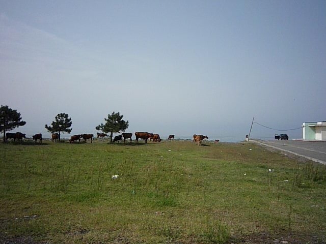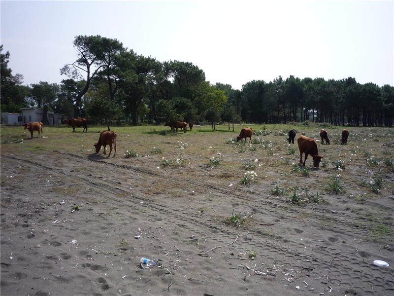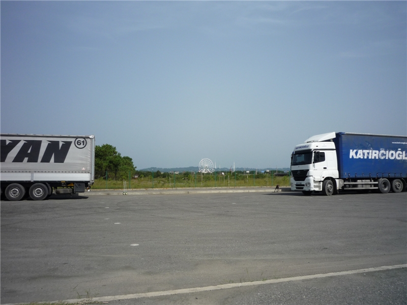Нашли заасфальтированную стоянку фур, стоят два турецких грузовика, рядом пасется стадо коров, что они там, на песчано-галечном пляже едят, непонятно, какие-то цветочки непонятные на пляже, а недалеко, опять же в чистом поле – колесо обозрения.