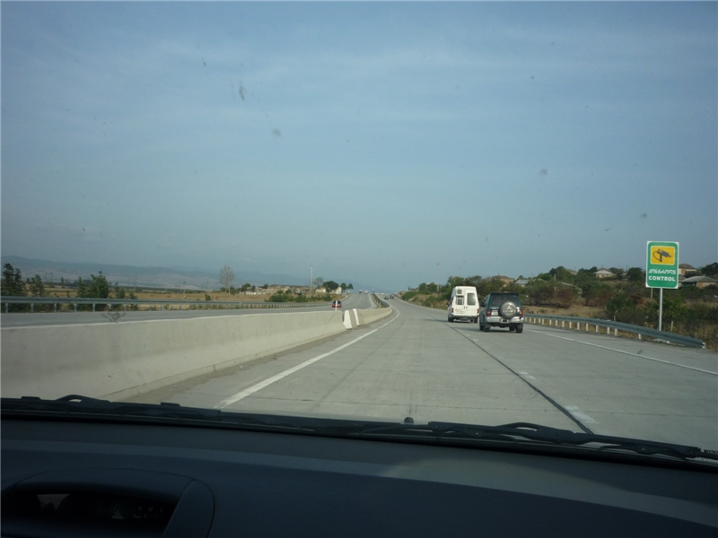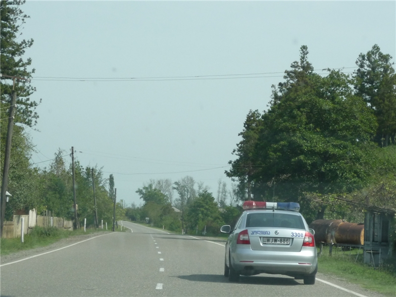 Карта Грузии в Навителе оказывается полным дерьмом, поэтому едем в основном по дорожным указателям, которые, слава богу, имеют двойное написание – грузинское и английское. Сворачиваем на Ланчхути-Самтредиа, чтобы срезать дорогу на Кутаиси, тем более, что по дорожным указателям так и получается. Обычная деревенская двухполосная дорога, правда, без ям. Просто типичная советская дорога. По ней исправно ездят полицейские автомобили.