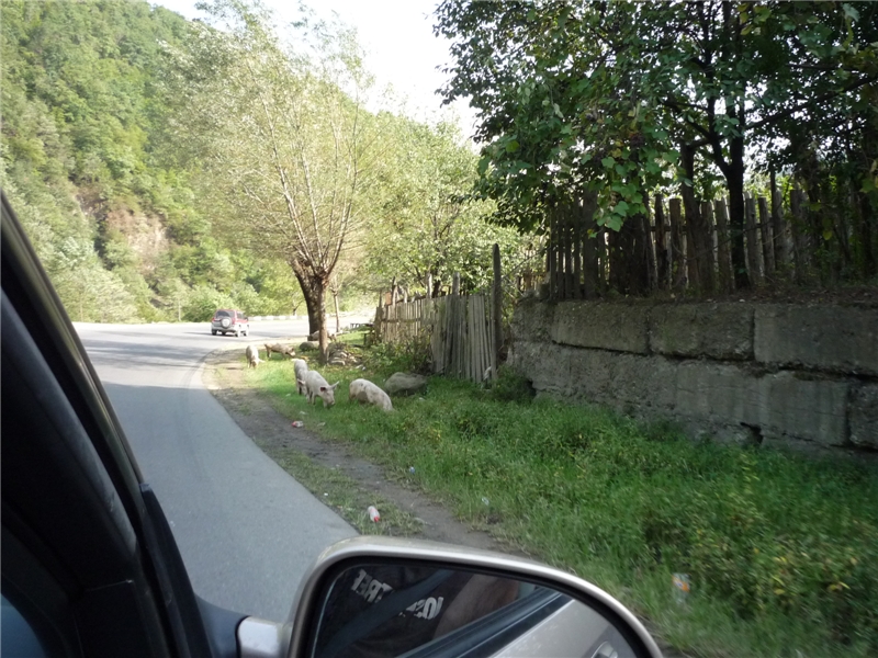 Проезжаем деревушку. Грузинские свиньи и поросята точь-в-точь, как в Абхазии, такие же поджарые и быстроногие.